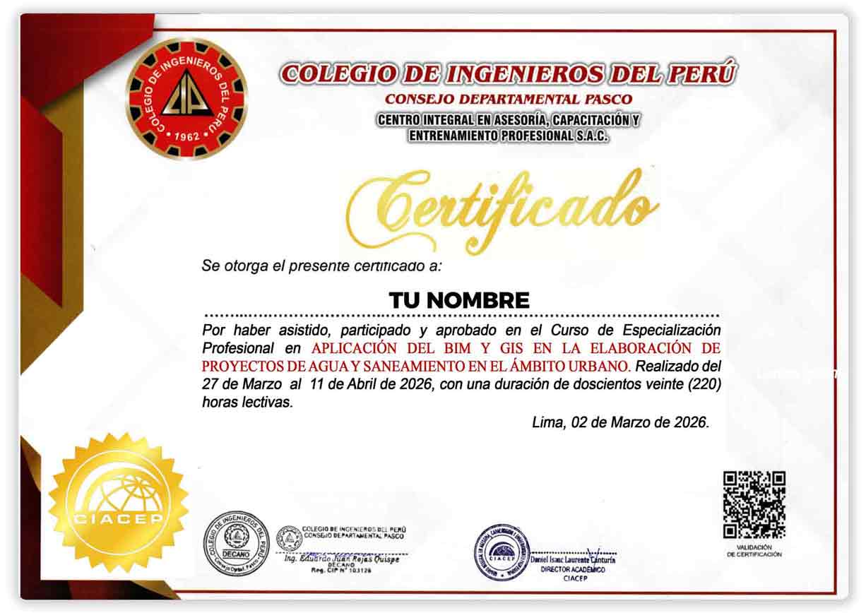 Curso de Especialización en integración BIM y GIS para proyectos urbanos de agua potable y alcantarillado, enfocado en expediente técnico, diseño hidráulico, modelado BIM con Revit, interoperabilidad con Civil 3D y coordinación 3D–4D bajo marco ISO 19650 y Plan BIM Perú.