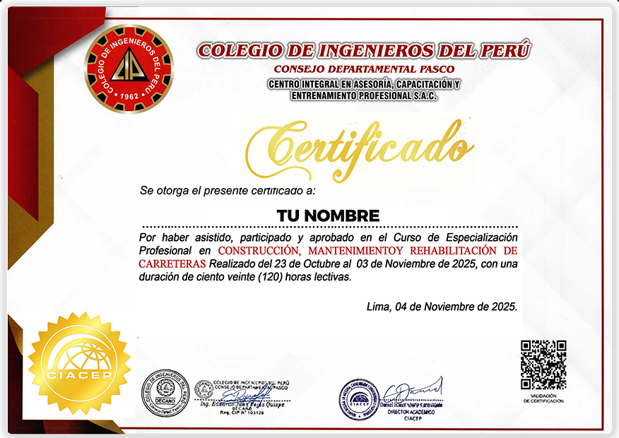 Certificación por 120 horas lectivas a nombre del Colegio de Ingenieros del Perú