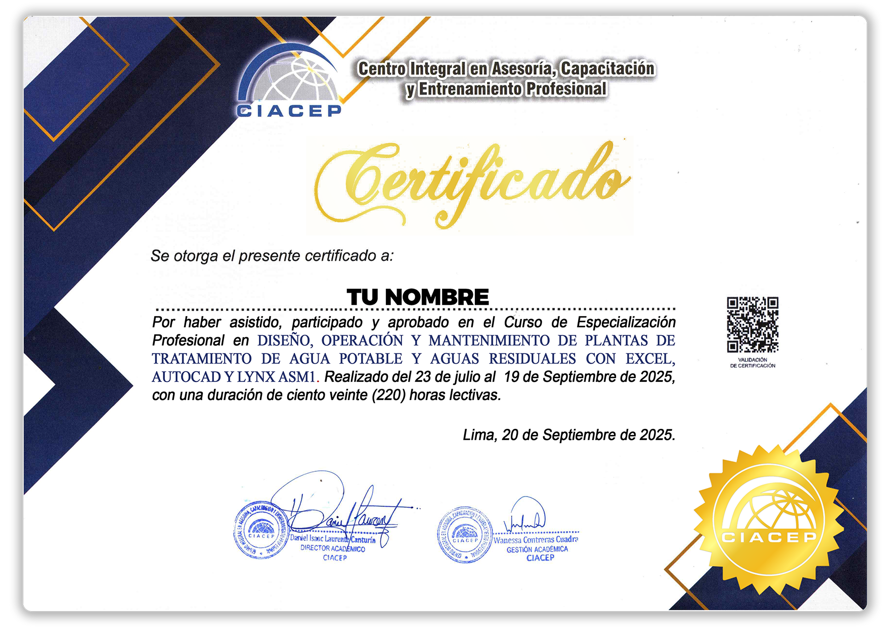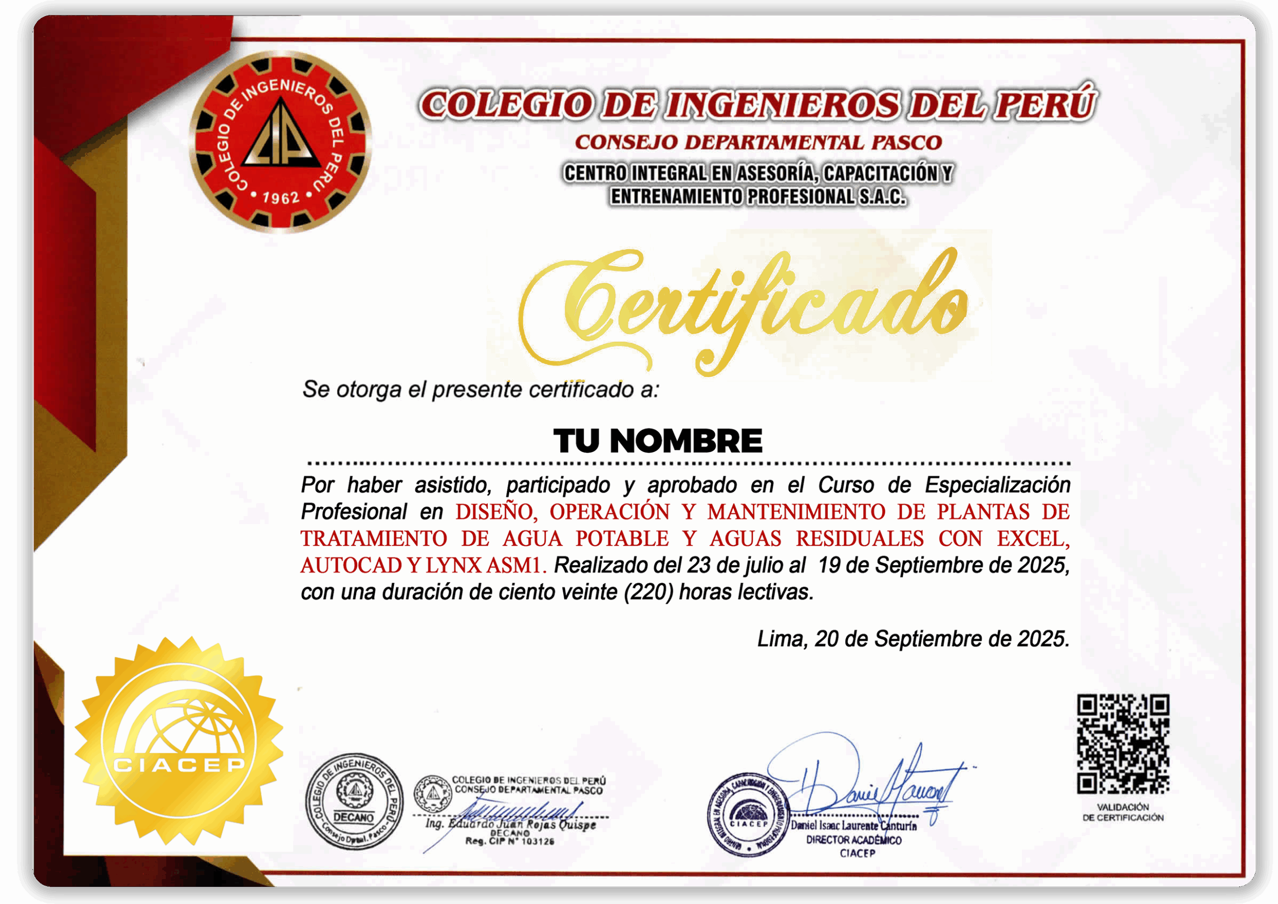 Certificación por 220 horas lectivas a nombre del Colegio de Ingenieros del Perú